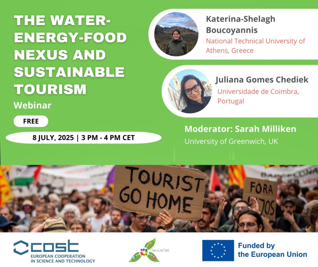 In this webinar, members of the NexusNet COST Action will present their perspectives on the importance of managing the resource demands of tourism through the Water-Energy-Food (WEF) nexus framework — to reduce environmental impacts, ensure resource security, and support the long-term sustainability of tourism destinations.
